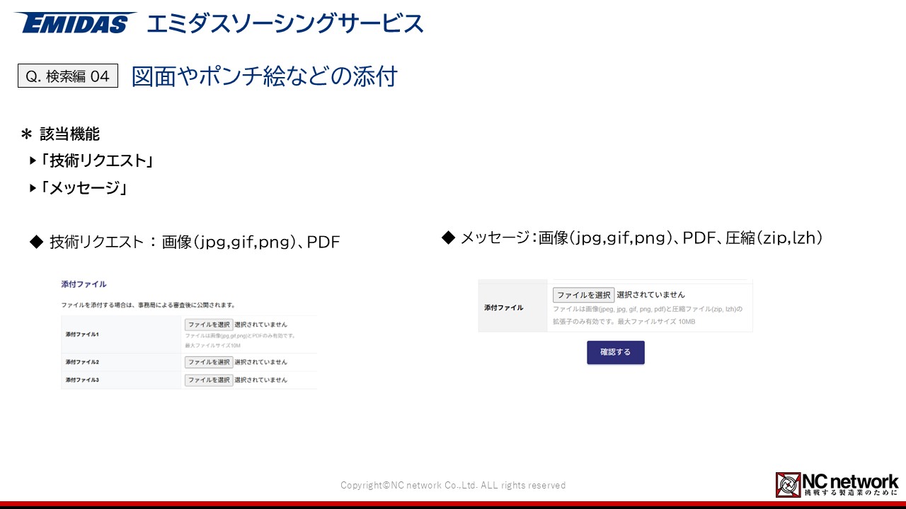 ・メッセージ機能(工場へ個別メッセージ):画像ファイル(jpeg,jpg,png)とPDF、圧縮ファイル(zip,lzh)を添付できます。※最大10MBまで。