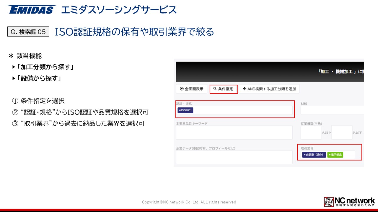 Q: ISO認証規格の保有や納品実績がある業界を指定して探したい
