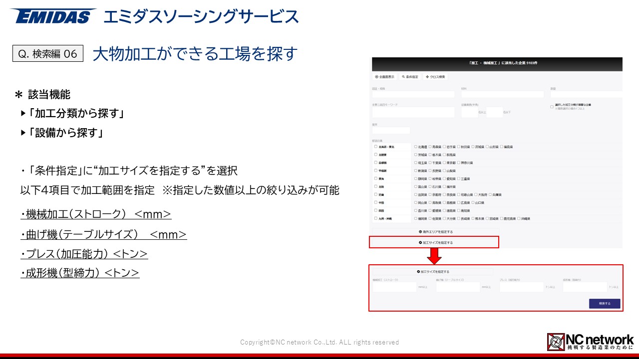 加工分類検索と設備検索の「条件指定」より加工サイズやトン数(成形機やプレス)で探すことが出来ます。